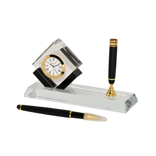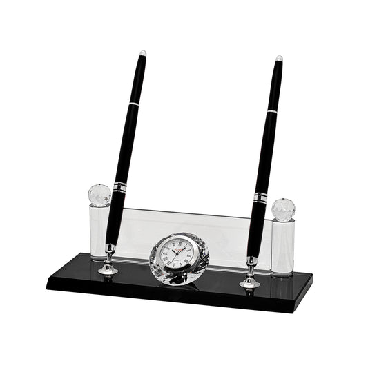 ستاند كريستال-ستايلو مع حامل قلم ثنائي و ساعة باللون الفضي