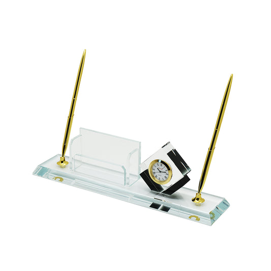 ستاند كريستال مع حامل كروت بزنس-وحامل قلم ثنائي وساعة باللون الذهبي
