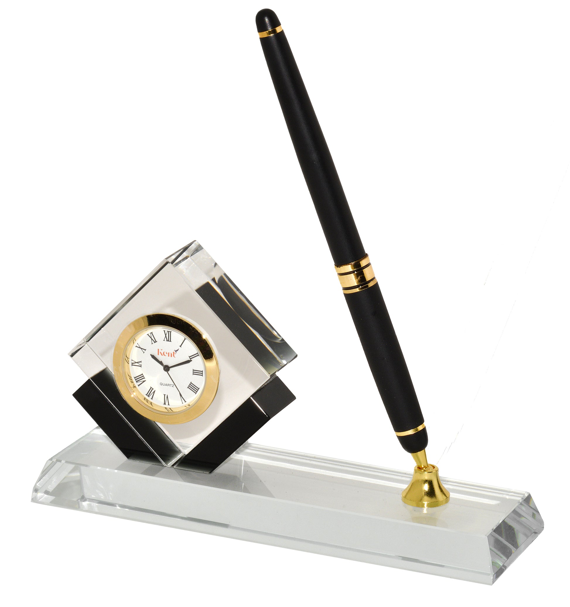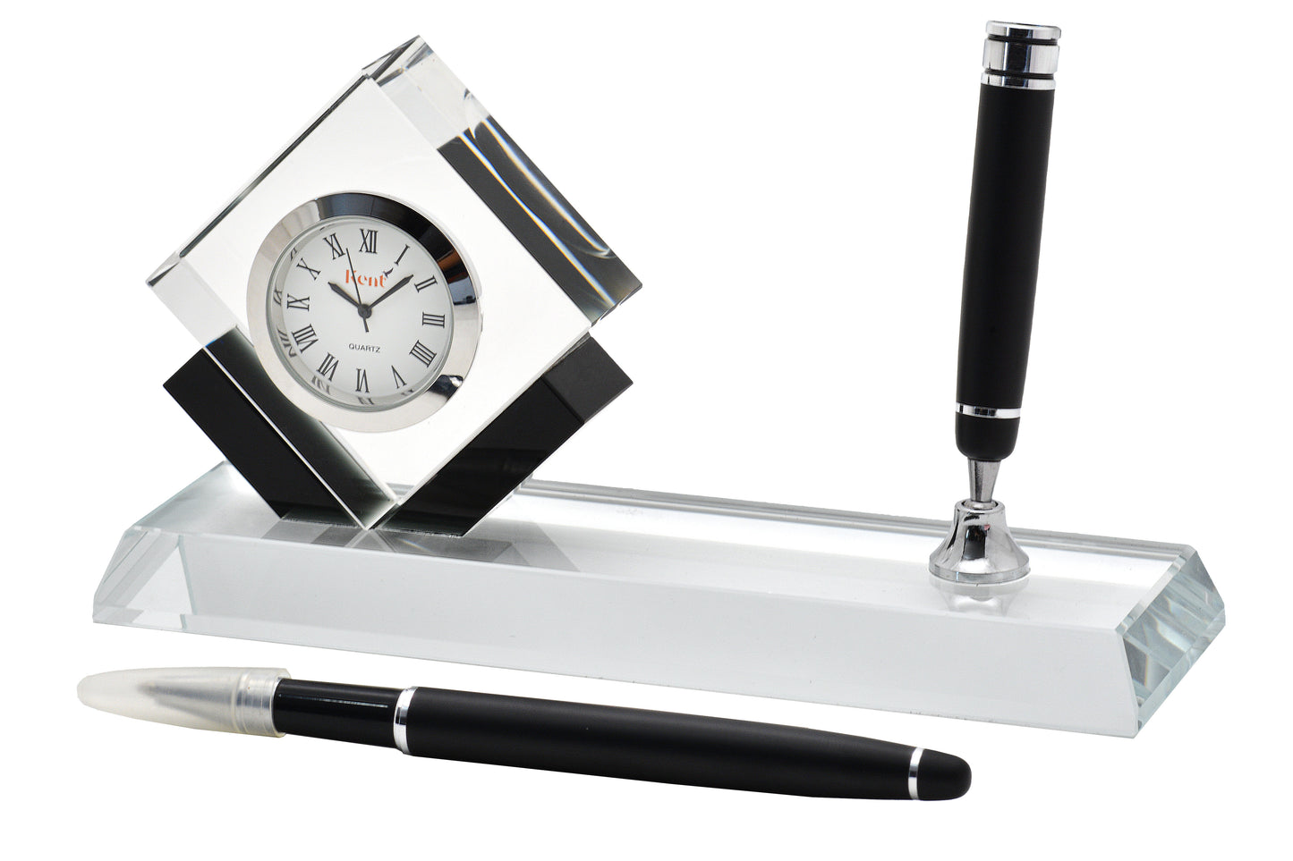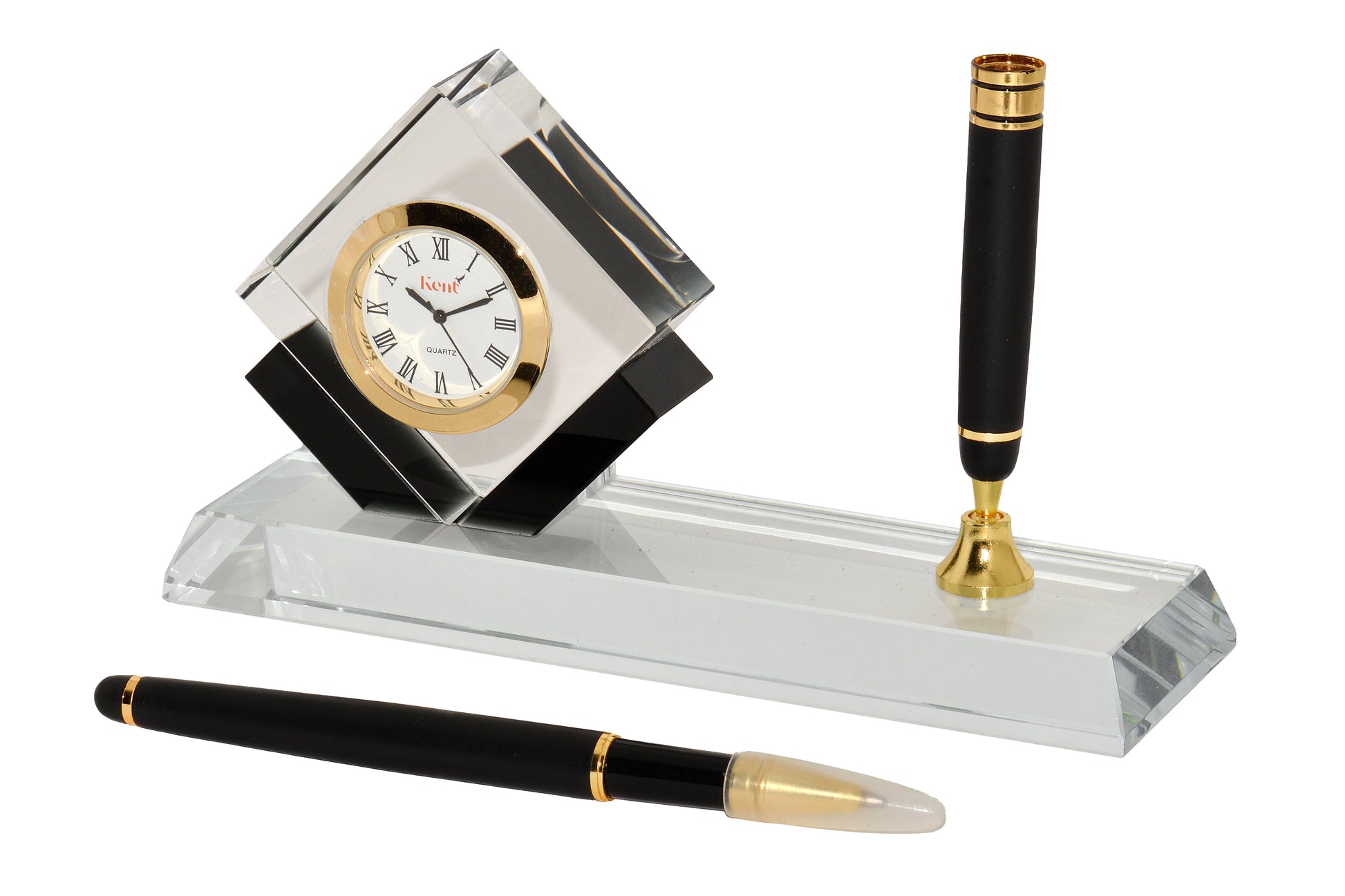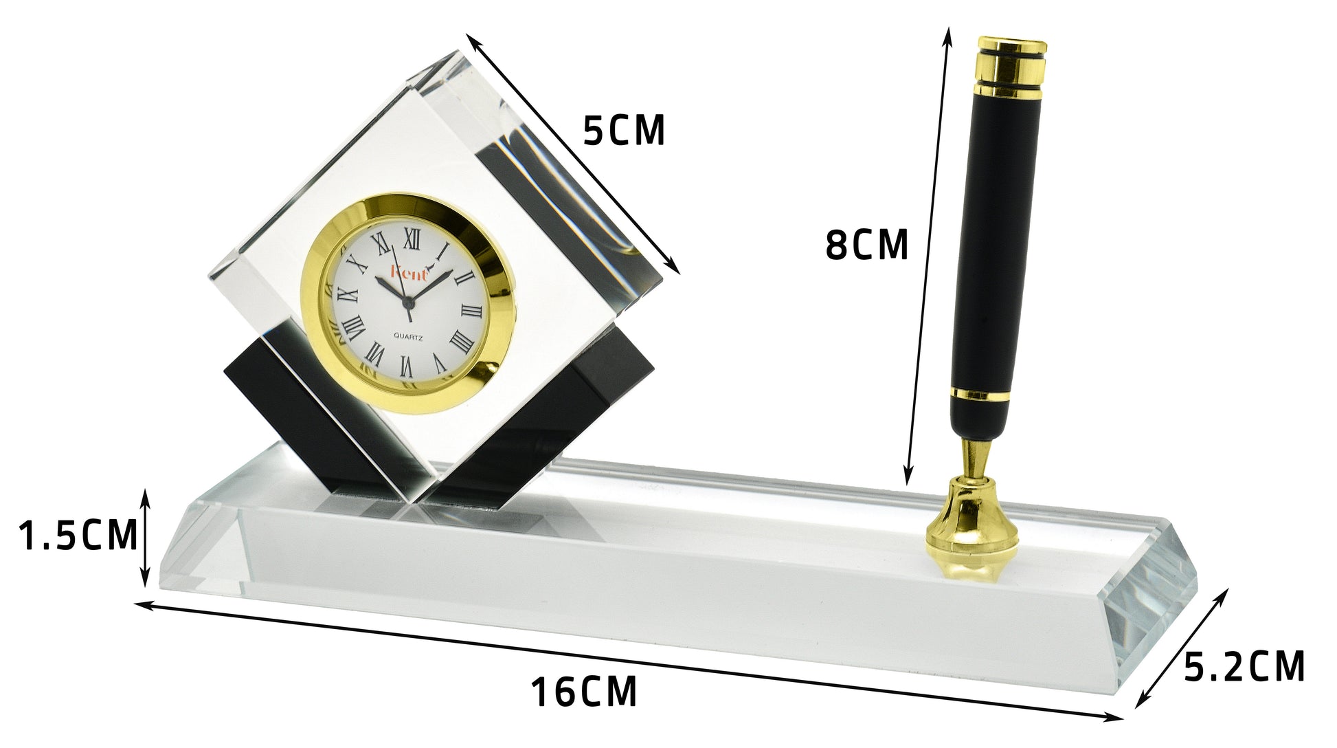 حيث ان القطعة الخاصة بنا مصنعة من الكريستال النقي مزودة بساعة معدنية ماركة كينت وحامل قلم معدني أسود لضمان الفخامة والعملية لمكتبكم .