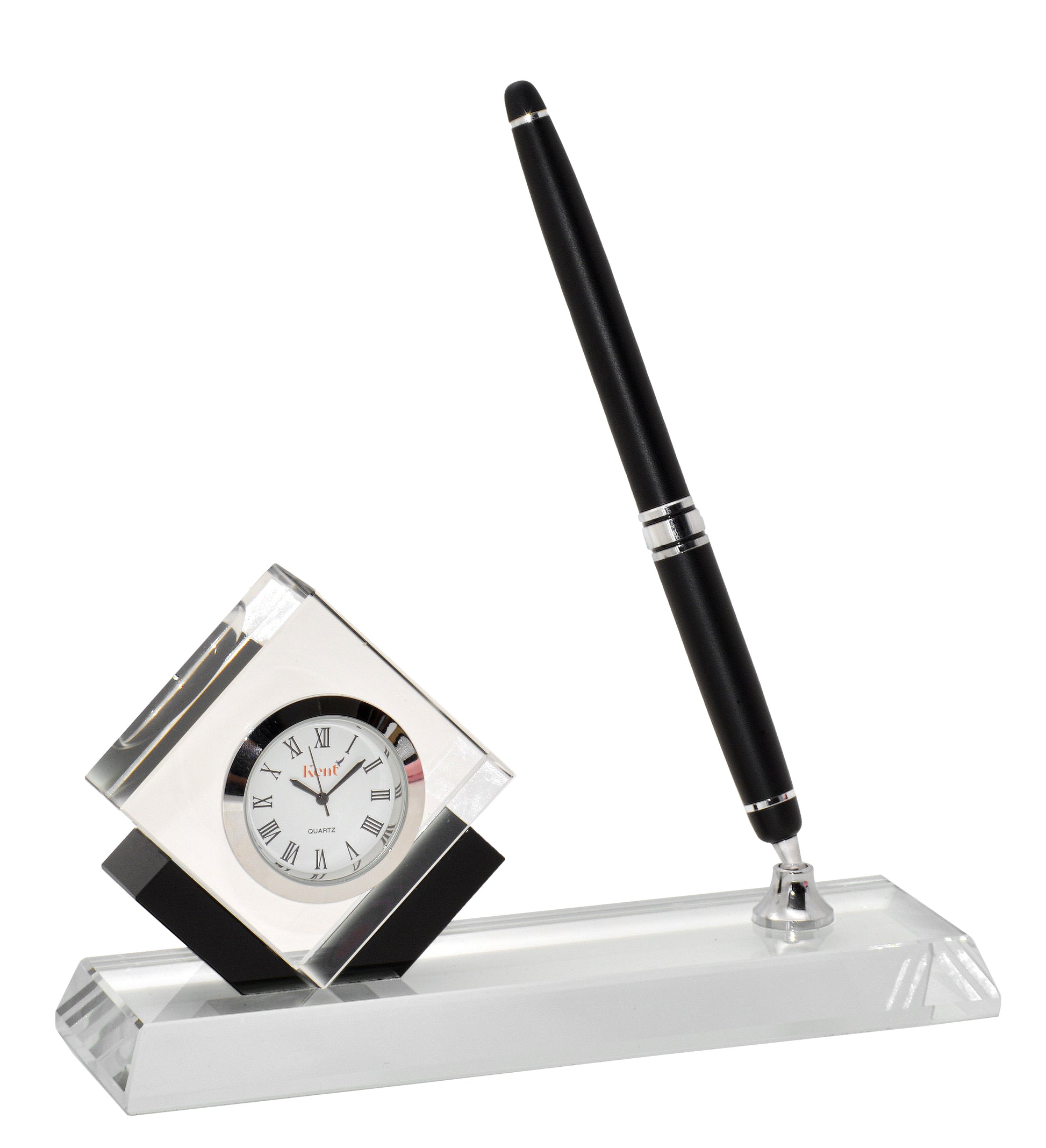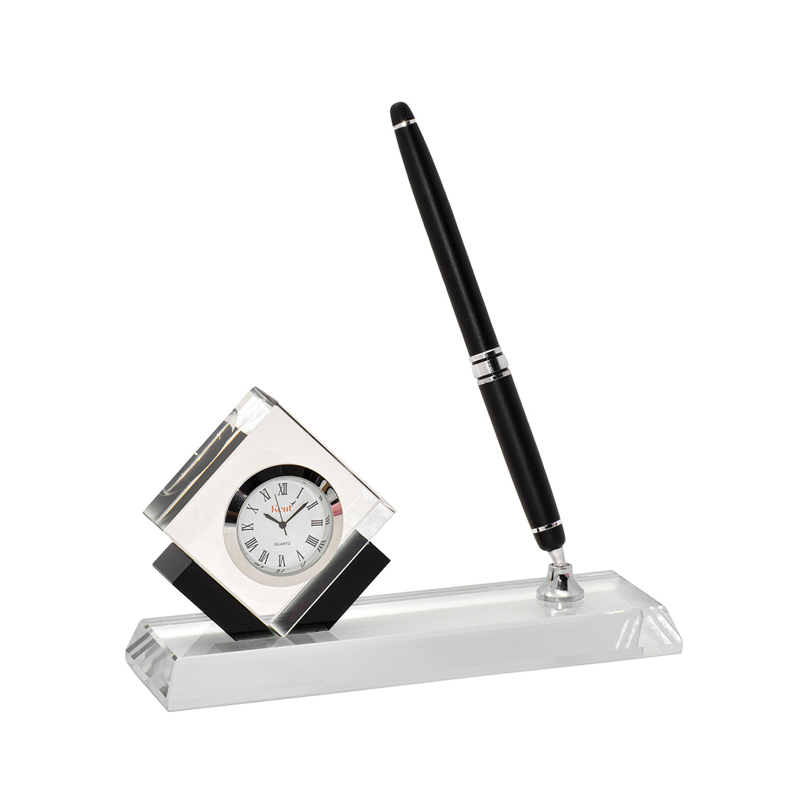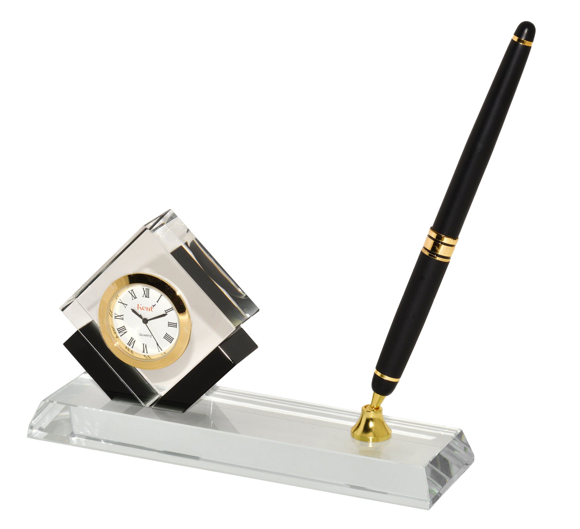 حيث ان القطعة الخاصة بنا مصنعة من الكريستال النقي مزودة بساعة معدنية ماركة كينت وحامل قلم معدني أسود لضمان الفخامة والعملية لمكتبكم .