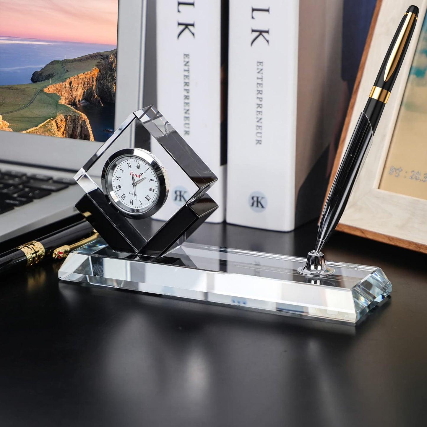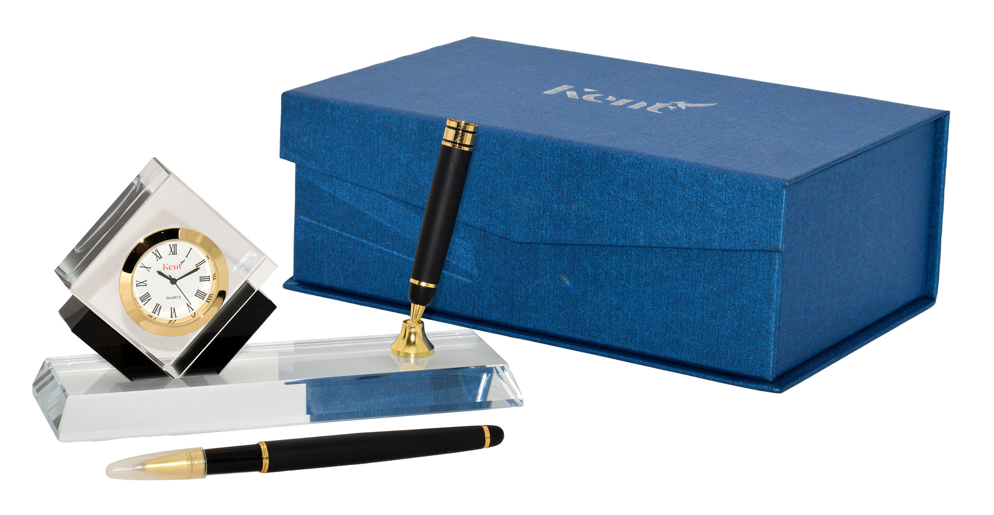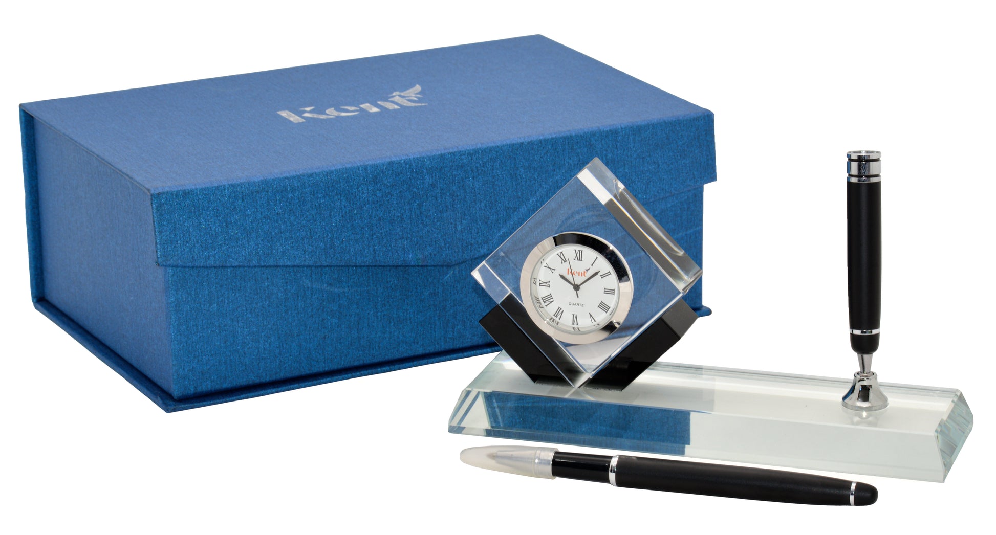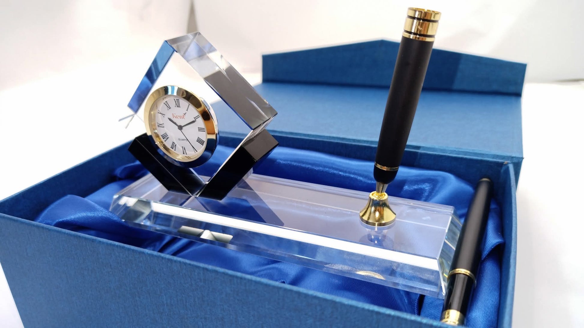 حيث ان القطعة الخاصة بنا مصنعة من الكريستال النقي مزودة بساعة معدنية ماركة كينت وحامل قلم معدني أسود لضمان الفخامة والعملية لمكتبكم .