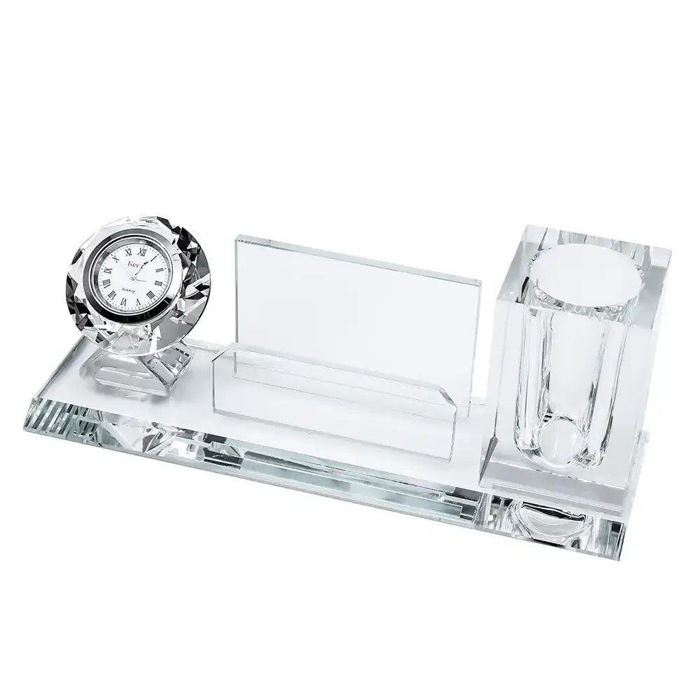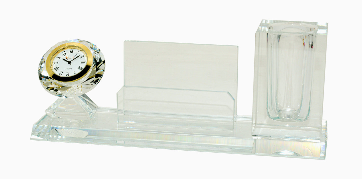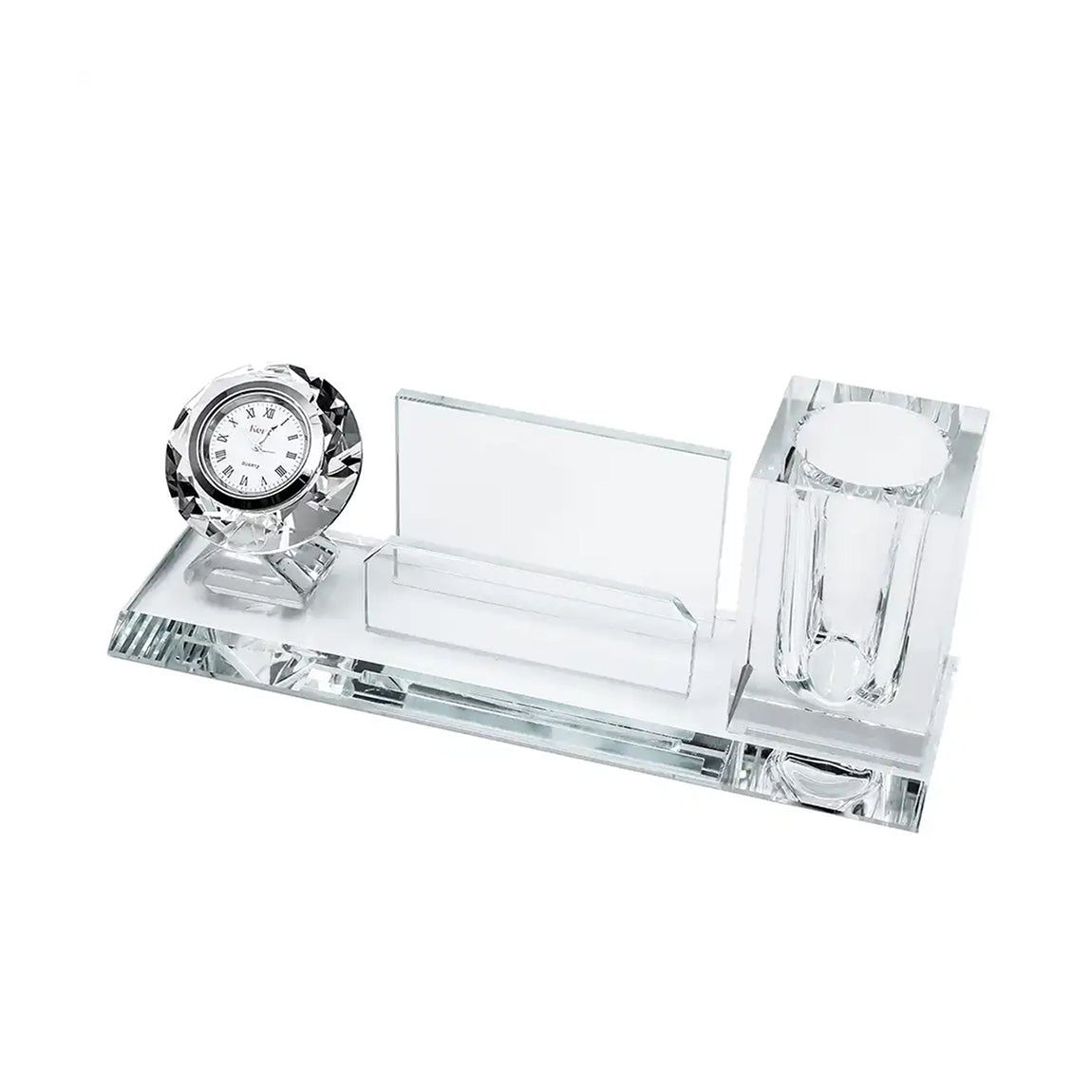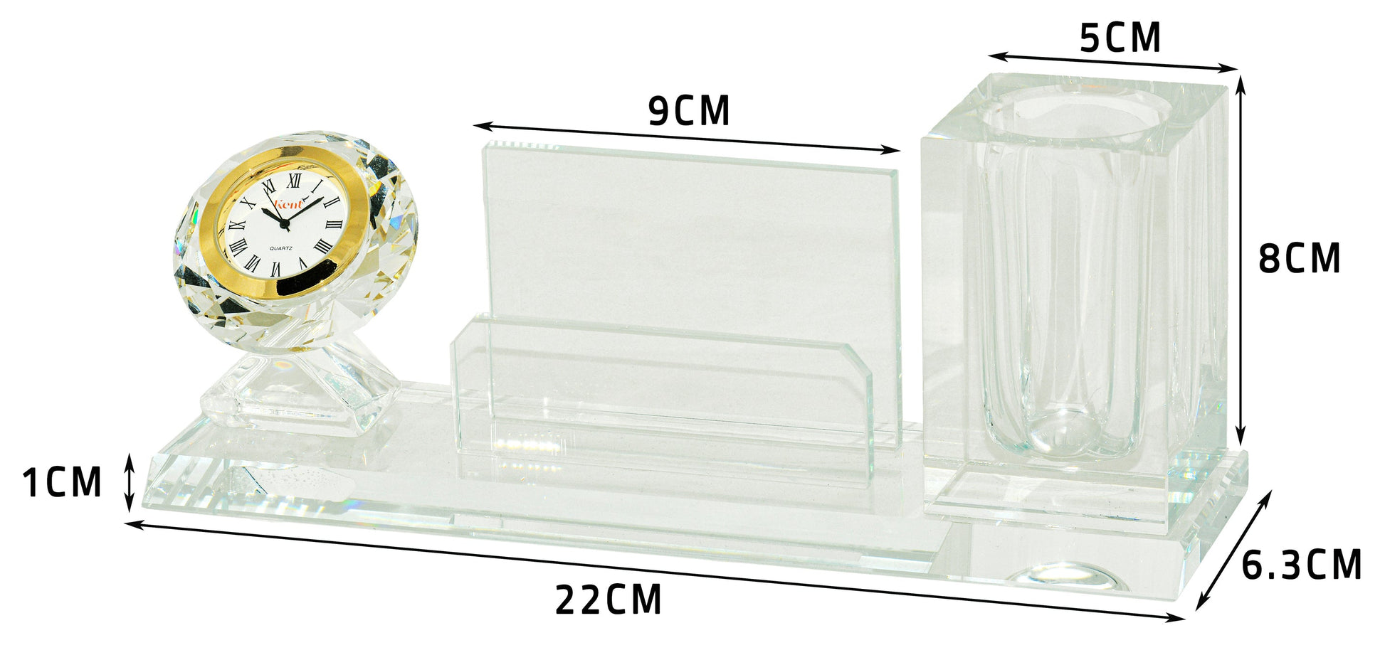 ستاند كريستال+مقلمة مع حامل بزنس كارد+ساعة باللون الذهبي