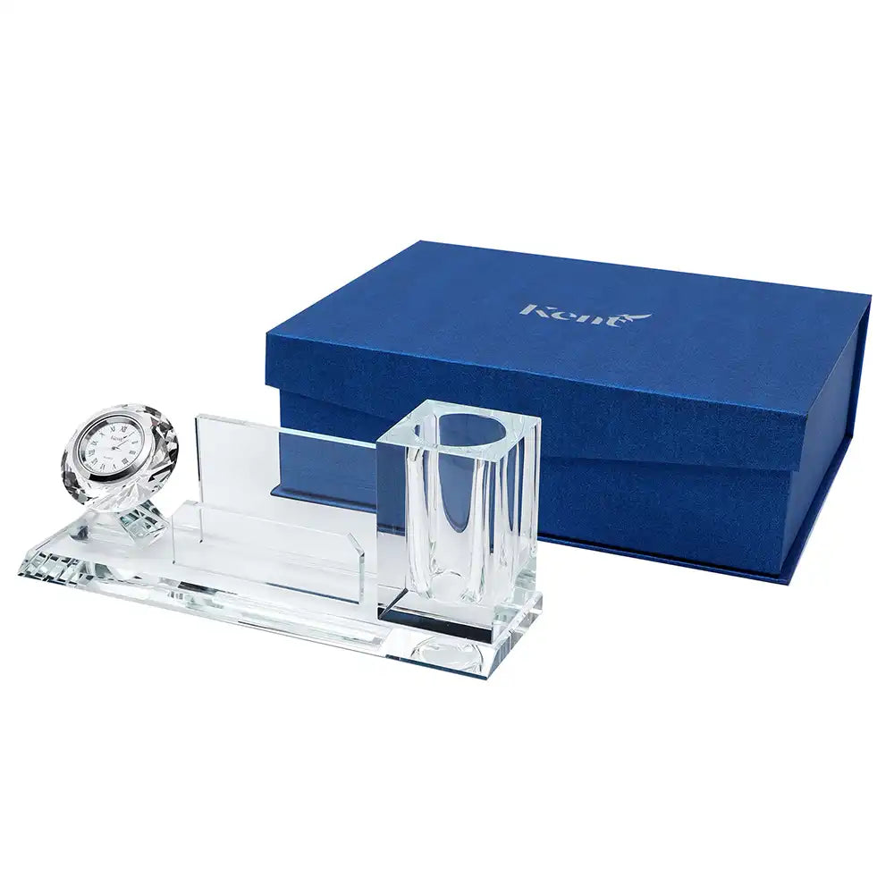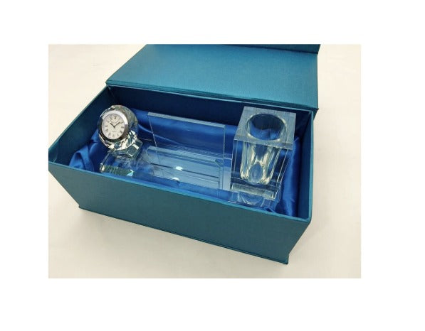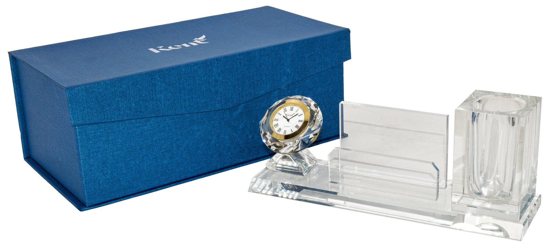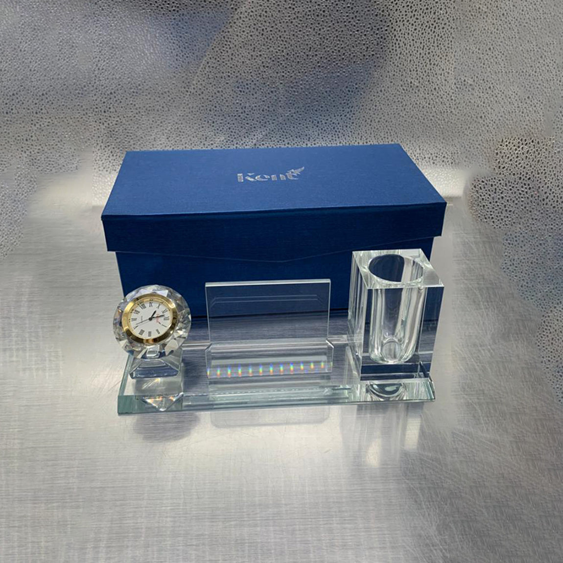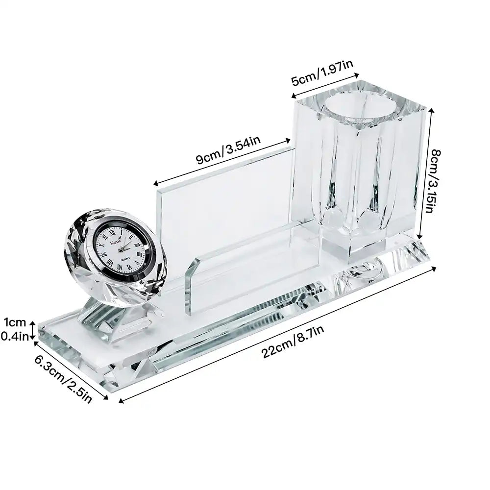 ستاند كريستال+مقلمة مع حامل بزنس كارد+ساعة باللون الذهبي